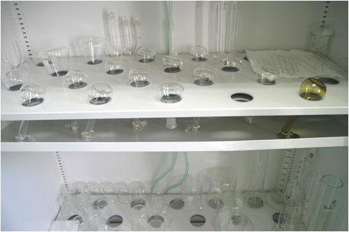 1、器皿柜柜體:側板、頂板、底板采用18mm優(yōu)質三聚氰胺板,經PVC 防水封邊處理。器皿柜層板采用優(yōu)質中密度板,經2mm厚PVC防水封邊,防酸堿、乃腐蝕性能好。所有層板高度均可調。試劑柜層板采用6mm 厚的Campact 板,加強層板的承重性能,層板開孔分別為Φ30mm 、Φ50mm 、Φ70mm 、Φ100mm 四種規(guī)格。